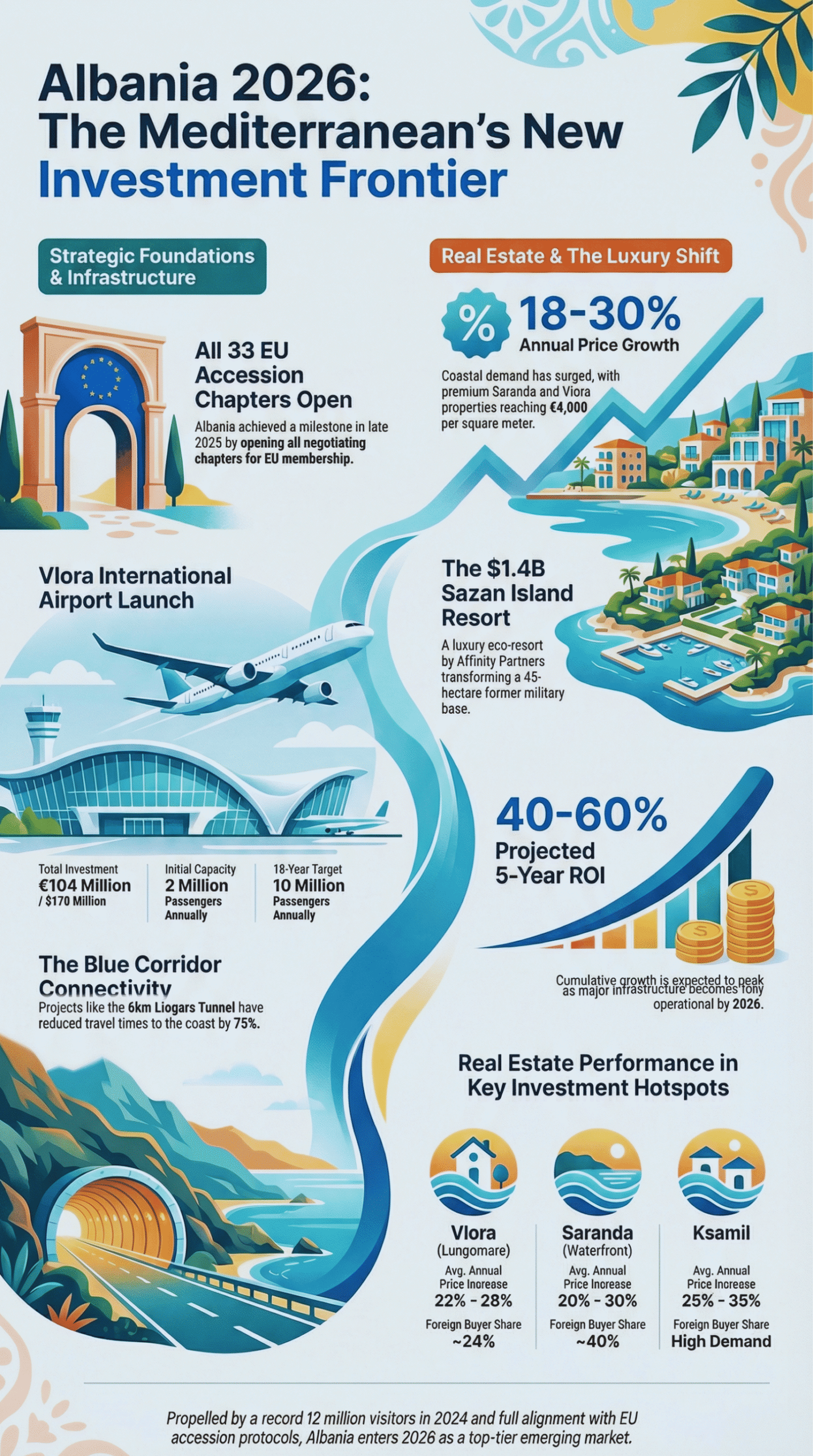 A new “village‑scale” resort between Palasë and Dhërmi, mixing villas, apartments and a large hotel complex with beaches, promenades and sports facilities. It targets high‑end second‑home buyers, but for the next years you should expect living inside a large worksite while phases complete.